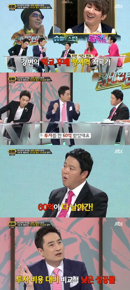 이날 강용석 변호사는 MBC '위대한 탄생 시즌1' 멘토였던 작곡가 방시혁을 언급했다. 그는 "방시혁이 고등학교-대학교 후배인데 '위탄' 멘토하면서 붕 떠서 투자를 60억 원 받았다고 하더라"고 밝혔다. 이어 "근데 신인가수 다섯팀을 키워서 2년 끌고 왔더니 60억 원을 다 날렸다"고 덧붙였다.