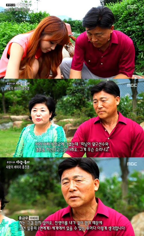 홍진영의 어머니는 "애 아빠가 학교에 갔는데 '따님이 야구선수와 결혼을 한다'고 그랬다더라. 아빠는 '무슨 소리냐'고 했었다"고 딸의 루머에 대해 언급했다.