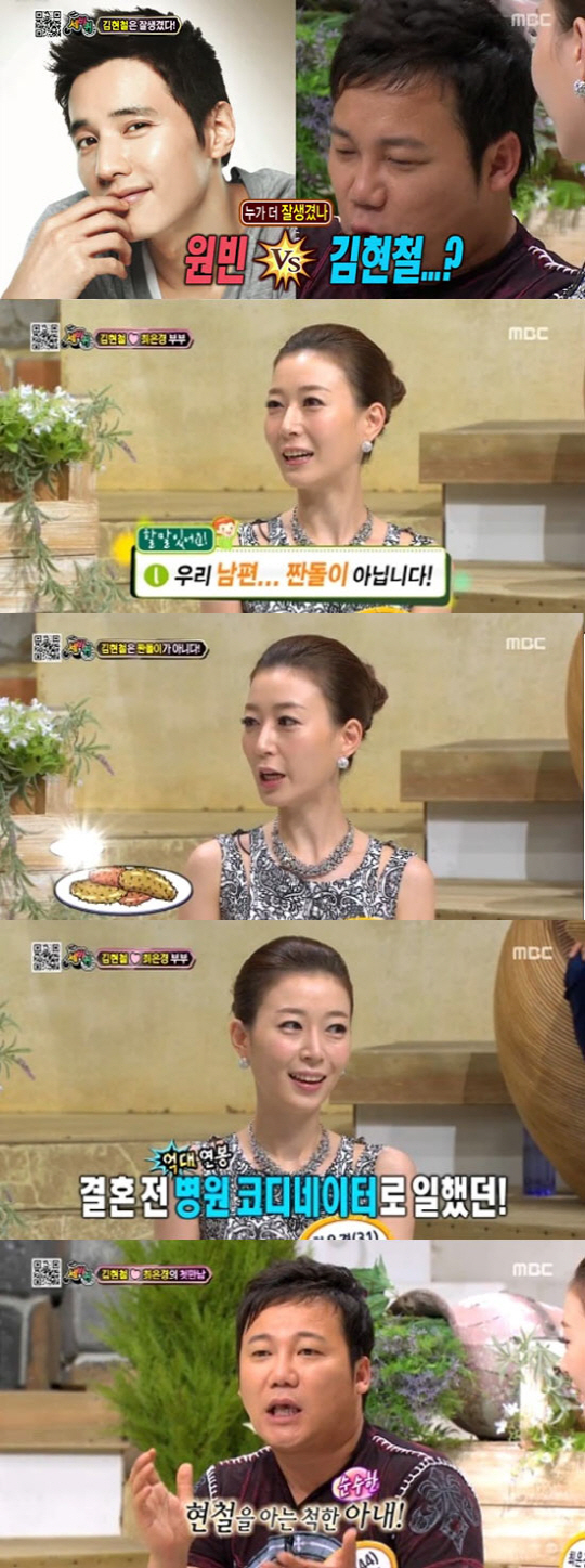 최은경 씨는 "남편의 복스러운 코, 오동통한 손, 볼록한 배는 근육이다"라며 김현철의 외모가 잘생겼다고 이야기해 스튜디오를 야유하게 했다.