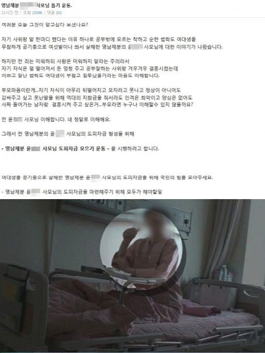 2002년 '여대생 청부 살인' 혐의로 무기징역을 선고받고도 자유로운 형집행정지로 VIP 호화병실 생활을 하는 모습으로 공분을 산 영남제분 회장의 전 부인 윤 모 씨에 대한 국민적 분노가 높아지고 있는 가운데 그녀를 돕자는 내용의 게시물이 올라와 시선을 모으고 있다.