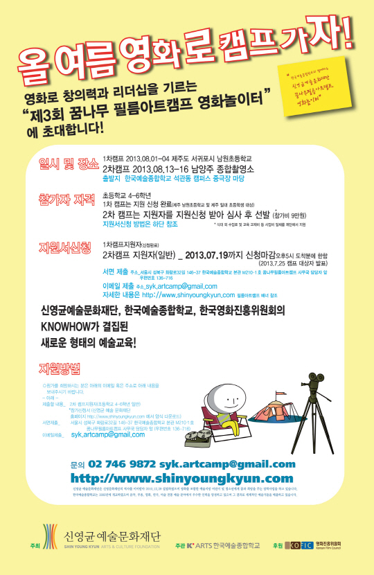 1차 캠프는 2011년까지 정부가 '예술 꽃 씨앗 학교'로 육성해 온 제주도 남원초등학교 및 제주 일대 초등학교 어린이를 대상으로 캠프 강사진이 현지로 이동해 실시한다. 2차 캠프는 경기 남양주 종합촬영소에서 개최하며 전국의 초등학교 4-6학년을 대상으로 공개 선발한다. 2차 캠프의 참가를 희망하는 어린이는 7월 19일까지 참가 신청서를 신영균예술문화재단 홈페이지(www.shinyoungkyun.com)에서 다운로드받아 제출하면 된다.