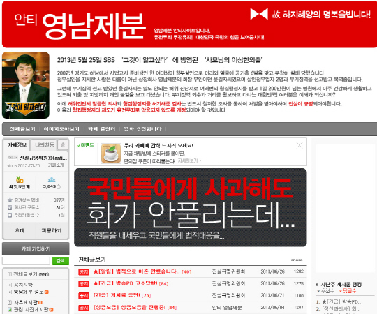 또 이 안티카페에서는 영남제분 불매운동 관련 정보와 故하지혜 양 사건의 진실규명을 위한 모금운동 등도 벌이고 있어 눈길을 끈다.