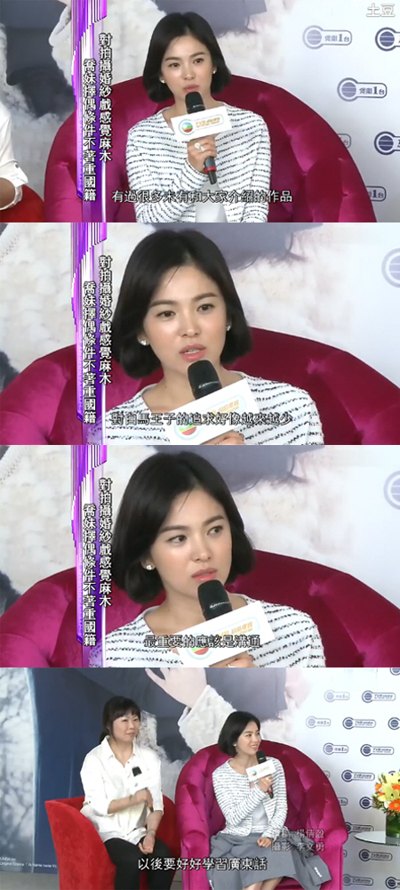 이에 진행자가 "홍콩 사람도 괜찮냐?"고 묻자 송혜교는 "괜찮다. 사랑에 있어서 마음만 잘 통하면 그런 건 필요 없다. 대신 홍콩 남자를 만나려면 앞으로 언어 연습을 더 많이 해야 할 것 같다"며 미소 지었다.