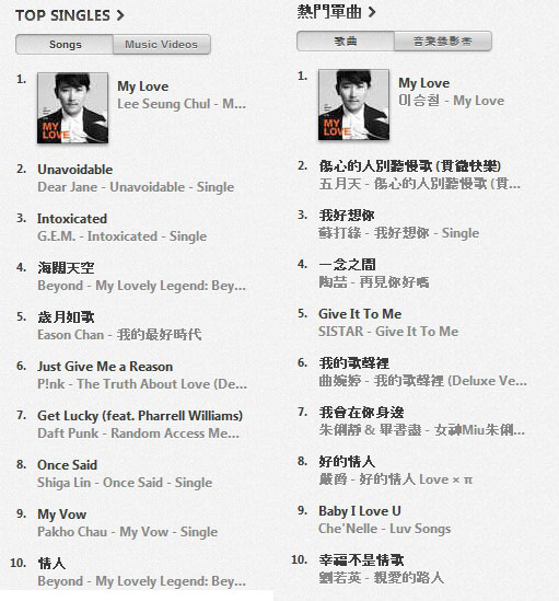 이승철은 2일 오전, 신곡 '마이 러브'로 홍콩과 대만 아이튠즈 싱글차트 톱 싱글즈 송즈 부문에서 1위를 차지했다.