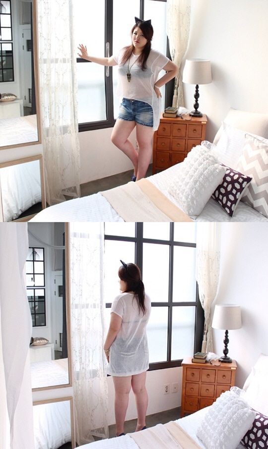 사진 속 이국주는 검정색 비키니를 입고 흰색 시스루 티셔츠와 청 반바지를 매치해 몸매를 선보였다. 특히 통통하지만 도발적인 눈빛과 자신감 넘치는 포즈가 시선을 사로잡는다.