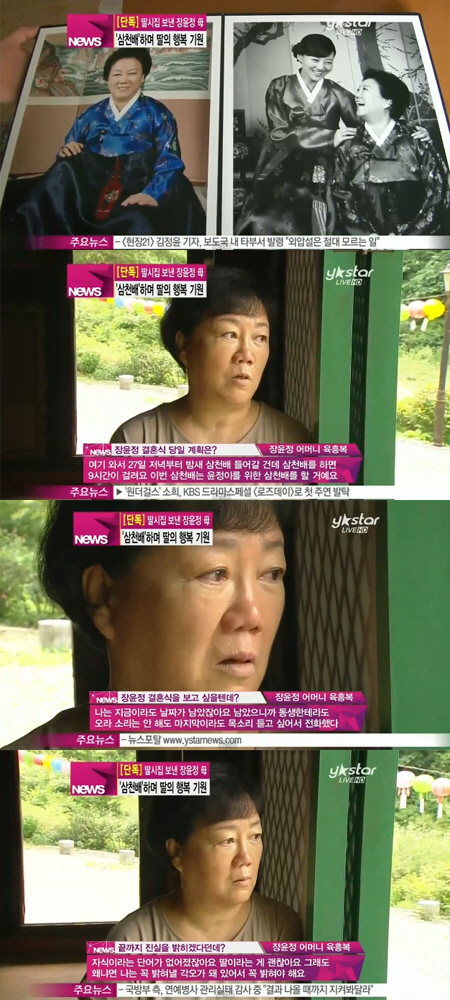 장윤정의 어머니는 "27일 저녁부터 밤새 삼천 배를 들어갈 건데 삼천 배를 하면 9시간이 걸린다. 이번 삼천 배는 윤정이를 위한 거다. 내가 유일하게 할 수 있는 거란 걸 윤정이가 알 거다. 아마도 그때는 밤새 울 거 같다"고 털어놨다.