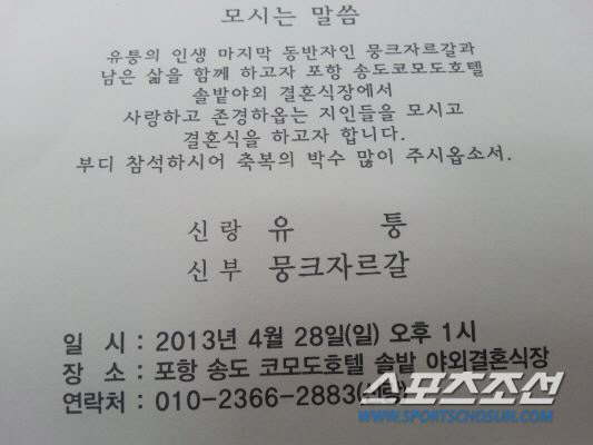 결혼 계획에 대해 그는 "한국에서는 기왕 무산됐으니 당분간 보류하고 몽골에서 먼저 결혼식을 하겠다"고 밝혔다. 그는 다음달 8일 몽골 전통혼례식으로 백년가약을 맺는다. 결혼식 후 함께 귀국할 예정이다. 그는 "애초 몽골과 한국 등 두 번 결혼식을 하려고했다"면서 국내에서의 결혼식은 내년 6월로 계획하고 있다고 했다.