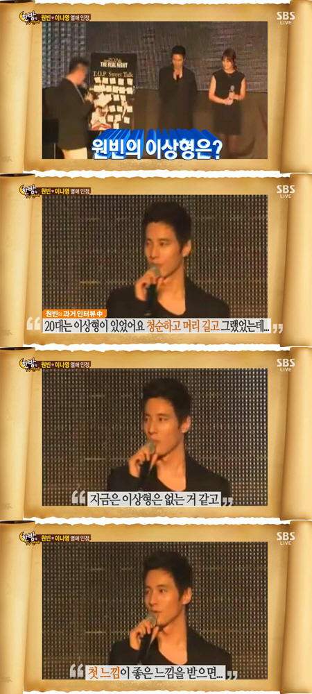 당시 원빈은 이상형 질문에 "20대는 이상형이 있었다. 청순하고 머리 길고 그랬는데 지금은 이상형이 없는 거 같다"며 "첫 느낌이 좋은 느낌을 받으면 되는 것 같다"고 답했다.