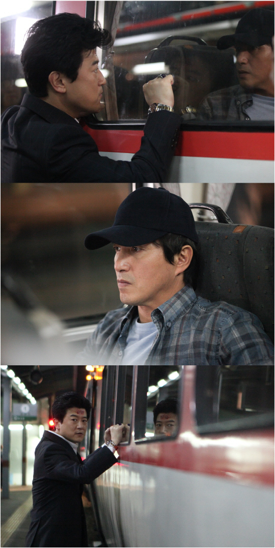 공개된 사진은 모든 것을 내려놓고 시골 생활을 하기 위해 서울을 떠나려는 명근과 의심의 끈을 놓지 않은 채 명근을 잡으려는 태하의 모습이다. 조재현은 기차 안에서 초점이 흔들린 불안한 눈빛으로 창밖을 응시하고 있으며, 박상민은 극 중 태하의 역할에 빠져들어 아들을 유괴한 범인을 눈앞에 둔 초조한 모습을 표현해냈다. 이 장면은 지난 6월 말 청량리역에서 촬영됐다. 늦은 시간임에도 불구하고 조재현과 박상민은 증오와 원망에 휩싸인 눈빛을 주고받으며 열연을 펼쳤다. 또한 기차 안에서 진행된 숨가쁜 도망신도 액션전문배우 못지않게 날렵하게 소화해내며, 강인한 체력을 뽐냈다.