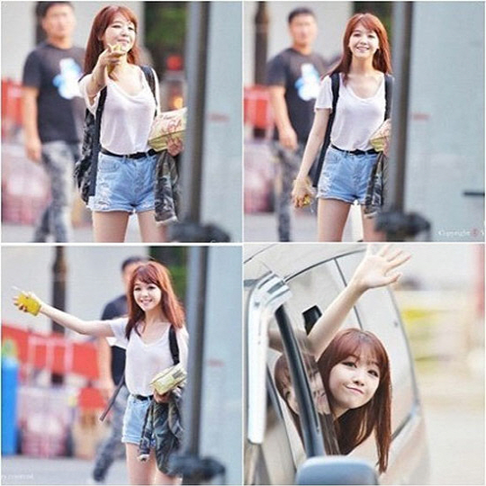 공개된 사진에는 퇴근길 팬들을 만난 민아의 애교 넘치는 상큼 발랄한 모습이 담겨 있다. 특히 무대에서 내려와 청반바지에 흰색 티를 입은 평범한 패션임에도 반짝이는 미모와 완벽한 몸매를 자랑해 눈길을 끈다.