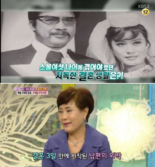 이어 "나와 작품을 같이하던 남자배우가 학교 동창이라며 재벌 2세를 소개시켜줬고, 적극적인 구애를 받아 만난 지 두 달 만에 결혼했다"면서 "그런데 알고 보니 유명한 바람둥이었다. 결혼 3일 만에 외박을 시작하더니 바람을 피더라"고 전했다.