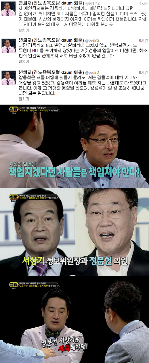 이어 진보측 패널인 이철희 두문정치전략연구소 소장이 "NLL 발언이 과장됐다면 책임을 지겠다던 사람은 마땅히 책임을 져야 한다"면서 서상기 정보위원장과 정문원 의원을 언급하자, 강용석은 "서상기 정문헌 사퇴해야죠"라고 직격탄을 날렸다. 그는 "이 정도 얘기하고 착오라 그러면..."이라며 강하게 밀어붙였다.