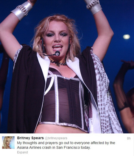 이 같은 소식에 브리트니 스피어스는 자신의 트위터를 통해 "오늘 미국 샌프란시스코에서 발생한 아시아나 항공기 착륙사고로 인해 피해를 입은 모든 분들을 생각하며 기도하겠다(My thoughts and prayers go out to everyone affected by the Asiana Airlines crash in San Francisco today)"며 안타까운 심경을 드러냈다.