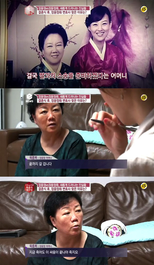 이어 딸 장윤정을 상대로 명예회손 등을 이유로 소송을 준비하겠다고 전한 어머니는 "끝까지 갈 겁니다. 지금 죽어도 이 싸움이 끝나야 죽는다"고 심경을 밝혔다.