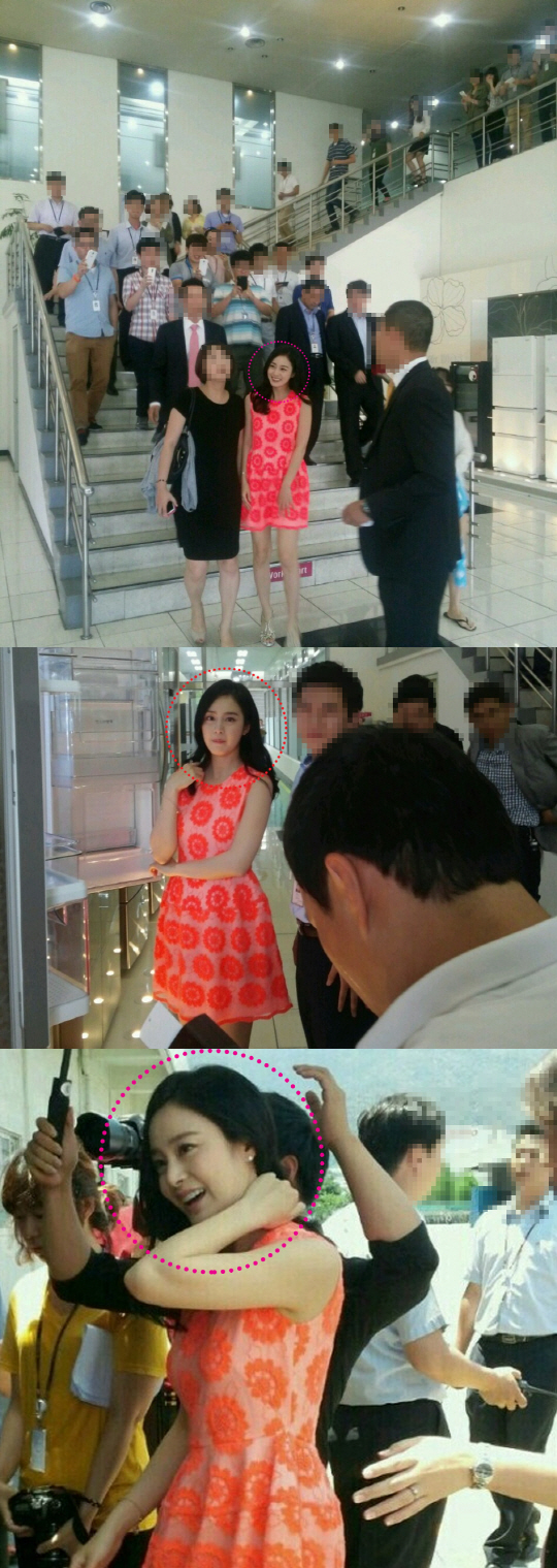 LG전자 디오스(DIOS) 냉장고 광고모델인 배우 김태희가 9일 경남 창원에 위치한 냉장고 연구소를 깜짝 방문한 모습이 회사 직원들의 직찍으로 포착됐다.