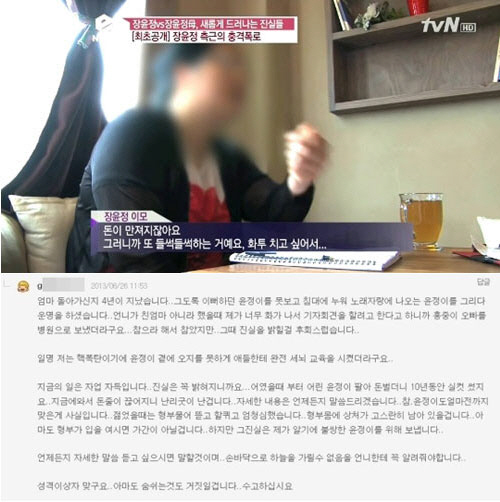 장윤정의 이모는 이 글에 대해 9일 방송된 tvN 'eNEWS-기자 vs 기자, 특종의 재구성'에서 "내가 인터넷에 올린 글은 100% 사실"이라고 밝혔다.