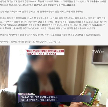 한편 9일 방송된 케이블 TV tvN 'eNEWS'의 화요일 코너인 '기자 대 기자: 특종의 재구성'에서는 본인을 장윤정의 이모라고 주장하고 있는 전 모 씨가 출연해 "블로그에 올린 100% 진실이다"고 주장해 이목을 끌었다.