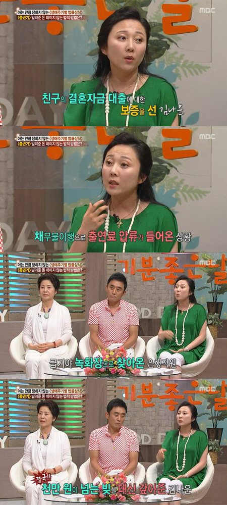 김나운은 10일 방송된 MBC '기분 좋은 날'에 출연해 "결혼 전 돈을 빌려줘서 못 받은 적도 많고 심지어 보증을 잘못 선 적도 있다"고 밝혔다.