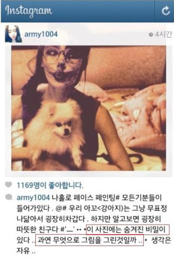앞서 아름은 자신의 인스타그램에 "나홀로 페이스 페인팅. 모든 기분들이 들어가 있다. 우리 아꼬(강아지)는 그냥 무표정 나 닮아서 굉장히 차갑다. 하지만 알고 보면 굉장히 따뜻한 친구다"라며 "이 사진에는 숨겨진 비밀이 있다. 과연 무엇으로 그림을 그린 것일까, 생각은 자유"라고 덧붙였다.