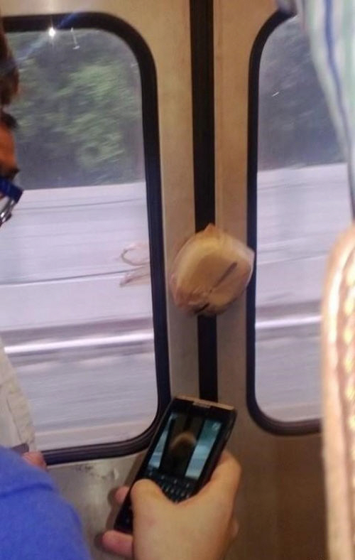 도시락 통은 지하철 내부에, 도시락을 담은 비닐의 손잡이 부분은 바깥에서 바람에 나부끼고 있다.