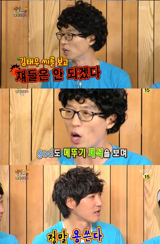이어 MC 유재석은 "내가 메뚜기 탈을 쓰던 시절 내가 출연하는 프로그램에 신인그룹 god가 출연했다. 노래는 정말 좋아서 기대를 많이 했는데 딱 한 사람, 김태우 씨의 외모를 보고 '아, 이 친구 때문에 안 되겠구나'라고 생각했다"고 돌직구를 날려 데니안을 폭소케 했다.