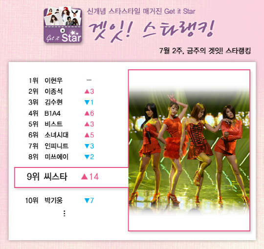 2013년 7월 2주에는 과연 어떤 스타가 시선을 끌었을까요?! 겟잇스타랭킹에선 여전히 '아이돌의 강세'가 이어졌습니다. 이 가운데 무려 14계단이나 상승, 다시 TOP 10에 진입한 씨스타가 눈길을 끄네요. 최근 'Crying'으로 분위기 변신에 성공한 4명의 여신 효린-보라-소유-다솜의 눈부신 활약을 계속 지켜봐 주세요.