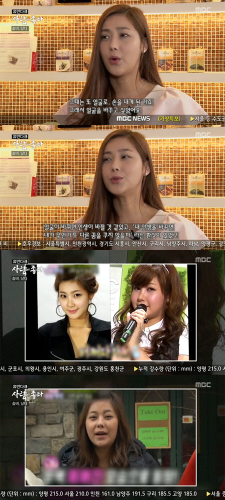 이날 방송에서 솔비와 절친한 헤어디자이너는 "처음에 화보촬영을 하는데 솔비가 '언니, 저 어디 고치면 예뻐질까요?'라고 하더라. 그래서 제가 손대지 말라고 그랬다. 지금 아주 예쁘니까 고칠 데 없다고. 진짜 그때. 그때 진짜 예뻤다"고 언급했다.