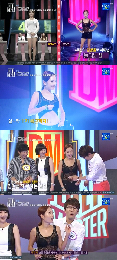 다이어트 도전 전 허리 사이즈가 33.1인치였던 정경미는 4주간 약 7인치 이상을 줄여 25.8인치의 개미허리로 거듭났다. 53.8kg이었던 체중도 8kg 이상을 빼며 45.4kg까지 감량하는 데 성공했다.