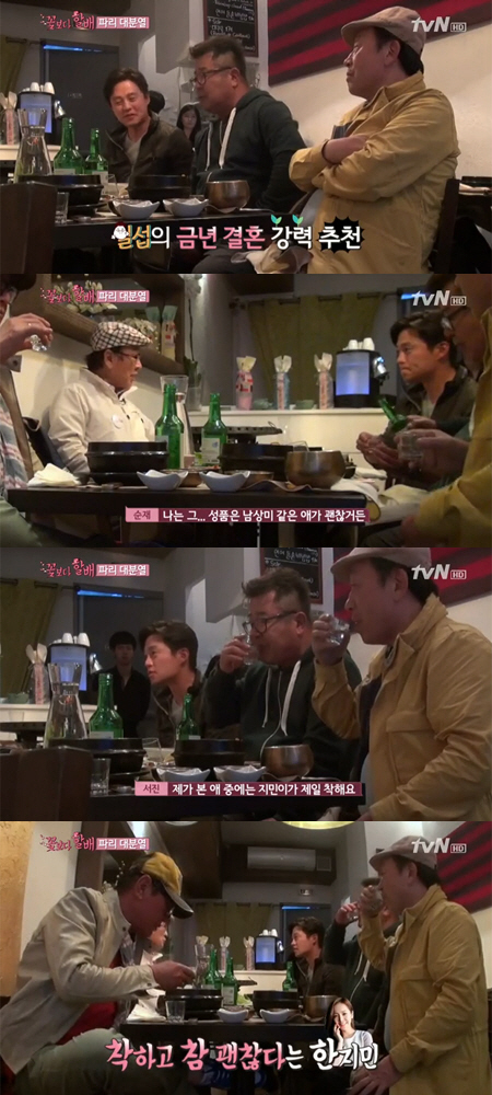 12일 방송된 tvN '꽃보다 할배'에서는 H4 이순재, 신구, 박근형, 백일섭과 이서진이 유럽 배낭여행 중 어느 한식당에 들러 함께 식사시간을 가졌다.