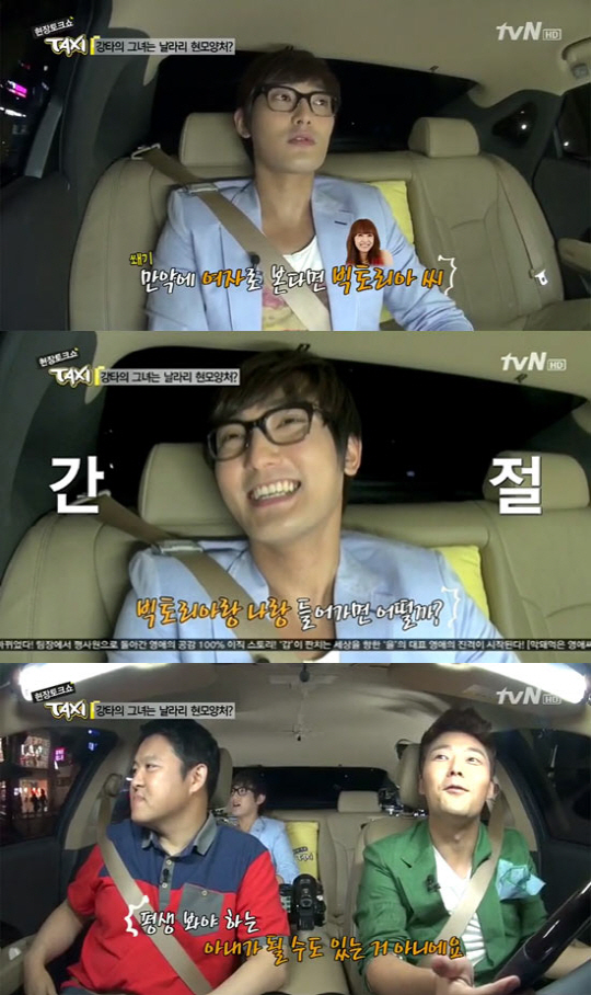 이어 그는 "놀 줄 아는 현모양처가 좋다"고 자신의 이상형을 설명했다. 이에 MC들은 '놀 줄 아는 현모양처'가 어떤 의미인지 의아해 했다. "같이 술 먹고 즐길 수 있는 정도의 의미를 뜻한다"는 그는 이상형에 가까운 특정 연예인으로 소속사 후배인 빅토리아를 꼽았다.