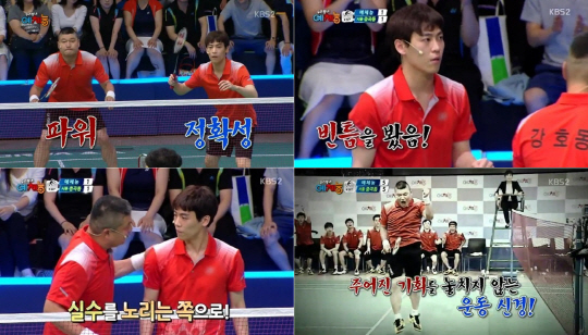 그런가 하면 강호동은 "최선을 다 하고 악착같이 괴롭히는 게 상대방에 대한 배려야"하고 말하며 상대방에 대한 예의도 잊지 않은 스포츠맨십을 선보였다. 이에, 파워와 섬세함이 완벽하게 조화를 이룬 강호동-존박 팀은 11:7로 값진 승리를 이끌어냈다.
