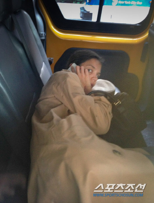 이날 자연스러운 웨이브머리를 풀어헤친 채 민소매 상의에 큰 재킷을 걸친 패션을 선보인 그녀는 파파라치의 카메라에 포착되지 않기 위해 택시 뒷좌석에 탑승한 후 누웠다. 하지만 이 모습마저도 파파라치의 카메라에 고스란히 포착되고 말았다.