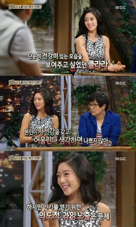 이어 "요즘 노출 패션이 논란이 되고 있는데 어떻게 생각하는가"라는 질문에 클라라는 "요즘 연예인분들이 몸매에 자신감을 갖게 되면서 노출 패션을 많이 입고 있는 것 같다. 본인이 자신감이 있고 어울린다고 생각하면 나쁘지 않은 것 같다"고 밝혔다.