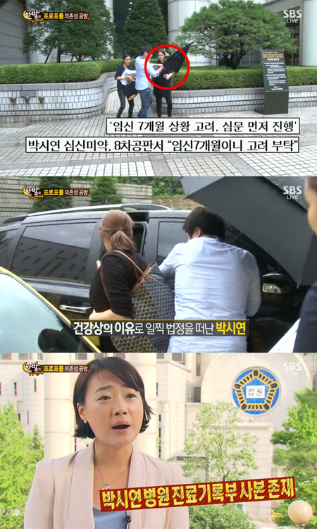 이날 먼저 증인 심문을 마치고 법정에서 나오는 박시연의 만삭 모습이 카메라에 포착됐다. 위아래 모두 블랙 의상을 입은 박시연은 카메라가 나타나자 고개를 숙인 채 준비된 차량에 올라탔고, 매니저는 박시연을 우산으로 가렸다.