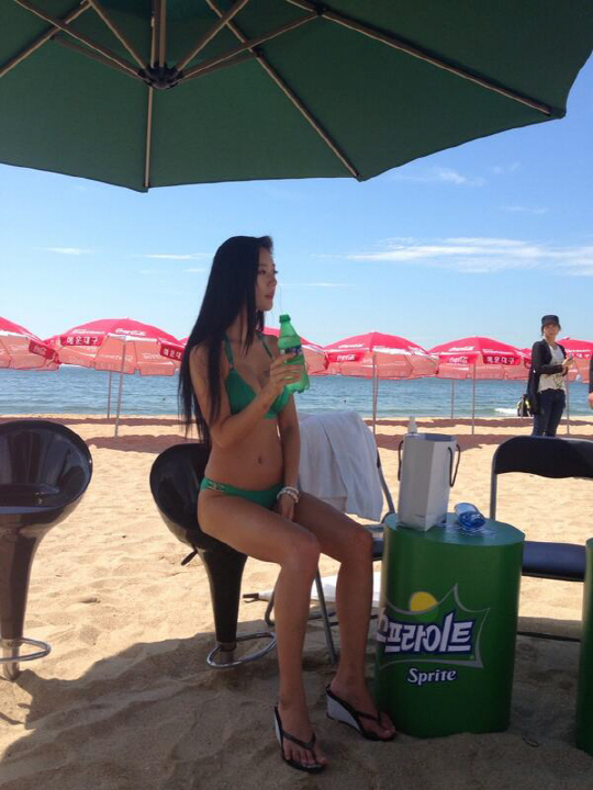 사진 속 클라라는 파라솔 아래에 마련된 의자에 앉아 스프라이트 음료를 든 채 잠시 휴식을 취하고 있는 모습이다. 이어 긴 생머리를 풀어헤친 클라라는 스프라이트의 행사에 맞춰 녹색 비키니 패션을 선보였다.
