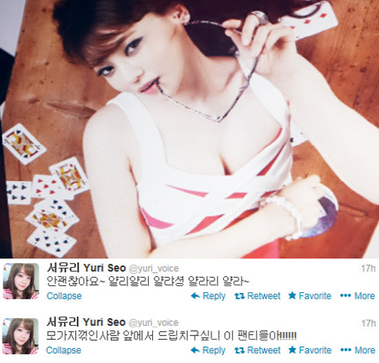 17일 서유리는 자신의 트위터에 "안 괜찮아요~ 얄리얄리 얄라성"이라는 글을 게재했다. 이어 "모가지 꺾인 사람 앞에서 드립 치구 싶니 이 팬티들아!"라며 격한 심경을 토로했다.