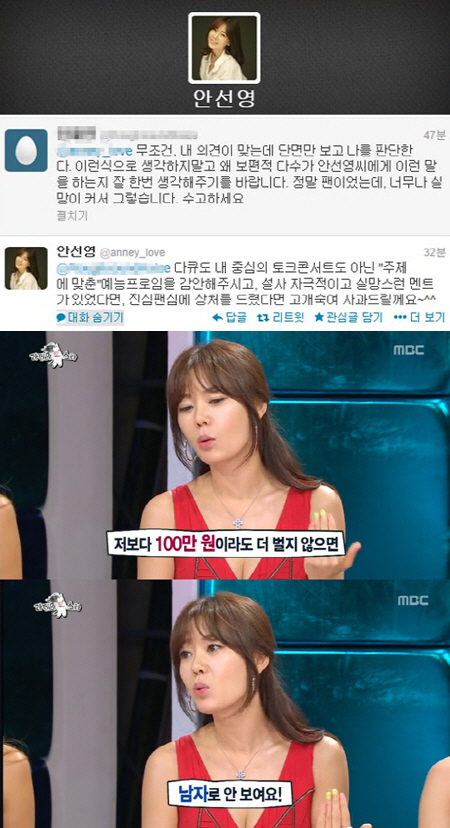 그러나 또 다른 네티즌은 "무조건, 내 의견이 맞는데 단면만 보고 나를 판단한다. 이런 식으로 생각하지 말고 왜 보편적 다수가 안선영씨에게 이런 말을 하는지 잘 한번 생각해 주시기를 바랍니다. 정말 팬이었는데 너무나 실망이 커서 그렇습니다. 수고하세요"라며 안선영의 발언을 질타했다.