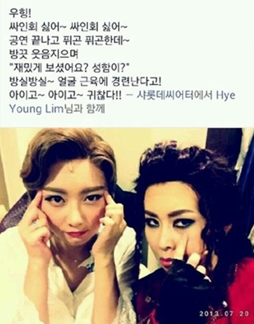 공개된 사진 속 백민정과 임혜영은 공연 후 진행되는 사인회가 싫다는 듯 울상을 지으며, 얼굴에 경련이 나는 듯한 표정을 짓고 있다