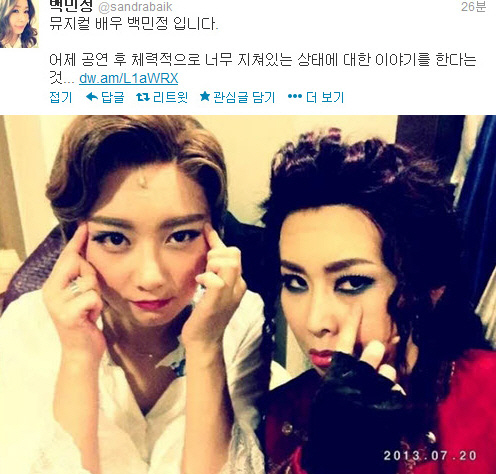 백민정은 21일 자신의 트위터에 "어제 공연 후 체력적으로 너무 지쳐있는 상태에 대한 이야기를 한다는 것을, 제가 생각이 짧았습니다"라며 "제 경솔한 표현으로 인해 실망하신 모든 분들께 진심으로 사죄드립니다"라고 입을 열었다.