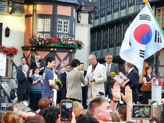 ◇연세대 콘서트콰이어 지휘자인 김혜옥 교수(가운데)가 지난 20일 독일 작센에서 열린 국제 요하네스 브람스 합창 콩쿠르에서 1등상을 수상하고 있다. 사진제공=연세대 콘서트콰이어