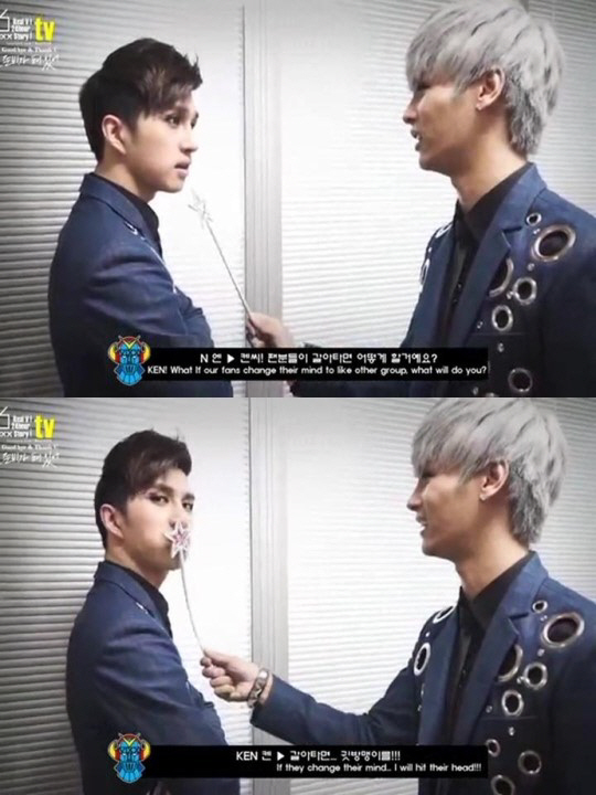그러던 중 엔은 "켄 씨! 팬분들이 갈아타면 어떻게 할 거에요?"라고 물었고, 켄은 "갈아타면 귓방망이를!"이라며 장난이지만 다소 과격한 표현을 사용했다. 이에 당황한 엔은 마이크 대용으로 들고 있던 별 모양의 물건으로 켄의 입을 급히 막았다.
