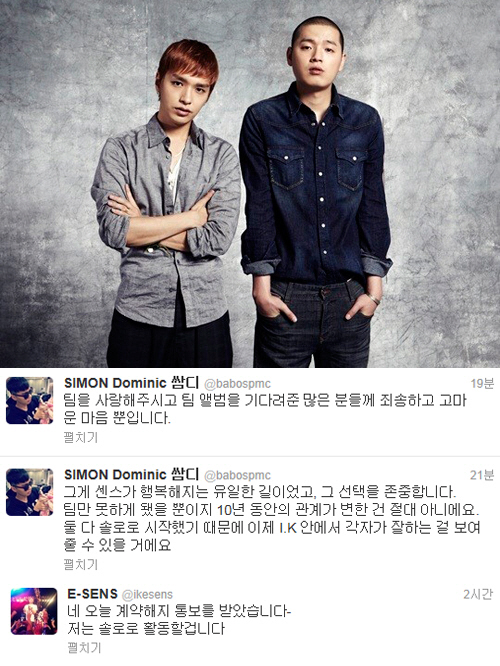 그는 "팀만 못하게 됐을 뿐이지 10년 동안의 관계가 변한 건 절대 아니에요. 둘 다 솔로로 시작했기 때문에 이제 I.K 안에서 각자가 잘하는 걸 보여 줄 수 있을 거에요"라고 밝혔다. 이어 "팀을 사랑해주시고 팀 앨범을 기다려준 많은 분들께 죄송하고 고마운 마음뿐입니다"라고 덧붙였다.