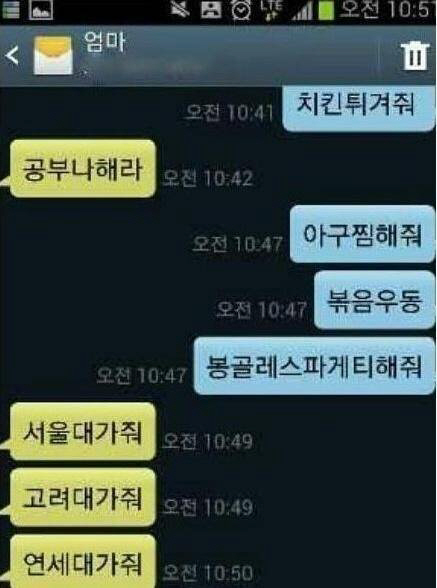 이에 자녀는 '아귀찜 해줘', '볶음우동', '봉골레 스파게티 해줘'라고 연속으로 공격하자, 엄마는 '서울대 가줘', '고려대 가줘', '연세대 가줘'라고 응수해 웃음을 자아냈다.