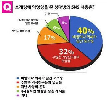 설문자 중 40%가 '비방이나 허세가 담긴 포스팅'이 소개팅에 악영향을 줬다고 대답했고 '수많은 이성친구들의 댓글들'이 32%로 뒤를 이었다.