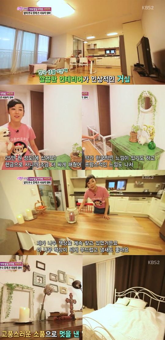 남다른 인테리어 감각을 자랑하는 그녀는 엔틱한 느낌을 낸 장식장을 가리키며 "25만원에 샀다. 현금으로 사니까 조금 더 싸게 해줬다"며 알뜰한 면모도 보였다. 이어 공개한 사유리의 침실은 화이트 풍의 깔끔한 침대와 고풍스러운 소품으로 멋을 낸 테이블 인테리어가 눈길을 끌었다.