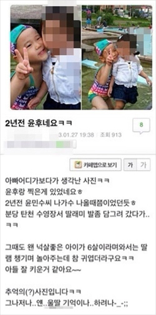글과 함께 올라온 사진에는 수영복을 입은 윤후가 글쓴이의 딸로 보이는 꼬마 옆에서 다정하게 포즈를 취하며 깜찍한 표정을 짓고 있는 모습이 담겨 있다.
