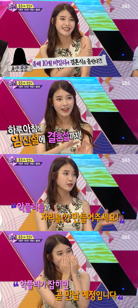 아이유는 23일 방송된 SBS '화신-마음을 지배하는 자'에 출연해 지난 5월 증권가를 뜨겁게 달궜던 10월 결혼설과 임신설에 대해 솔직하게 털어놓았다.