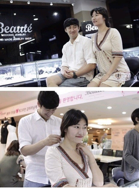 대기 의자에 앉아있는 순간에도 김미려의 손을 꼭 잡고 있는 정성윤의 모습이 눈길을 끈다. 또 김미려를 도와 함박웃음으로 목걸이를 착용해 주는 정성윤의 모습은 설레임 가득한 예비신랑의 모습이다.