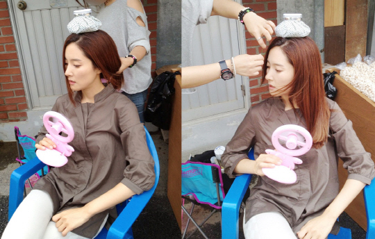공개된 사진에는 SBS 새 아침극 '두 여자의 방'에서 '은희수' 역을 맡은 왕빛나의 더위잡는 법이 담겨있다. 그는 더위를 식히기 위해 머리 위에 얼음주머니를 얹어놓고 미니선풍기로 여름 더위를 이겨내고 있는 모습이다. 특히, 짜증이 날법한 날씨에도 차도녀 포스를 물씬 풍기는 왕빛나의 오똑한 콧날과 V라인의 턱선이 눈에 띈다.