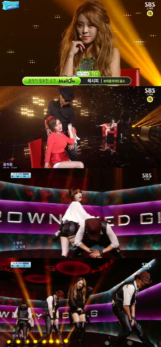 이날 브라운 아이드 걸스는 빨간 의자에 앉아 남성 댄서들과 아슬아슬한 제스처를 겸비한 '레시피'로 무대를 열었다. 한 층 더 농염해진 춤과 섹시한 보이스는 '성인돌'다운 면모를 발휘하며 남성 팬들의 마음을 설레게 했다.